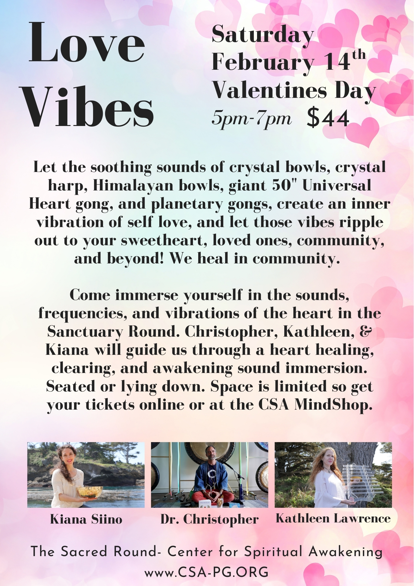 Come immerse yourself in the sounds, frequencies, and vibrations of the heart in the Sanctuary Round. Christopher, Kathleen, & Kiana will guide us through a heart healing, clearing, and awakening sound immersion. Seated or lying down. Space is limited so get your tickets online or at the CSA MindShop.
